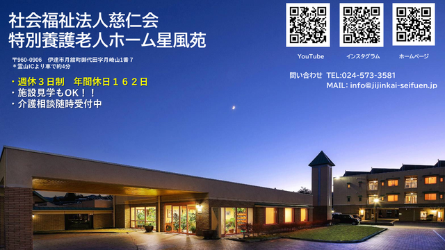 社会福祉法人慈仁会は福島県伊達市月舘町の緑に囲まれた閑静な高台にある介護老人施設「星風苑」を運営しています。