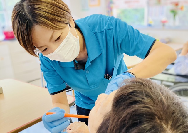 1番は「コミュニケーションと無理のない口腔ケア」を大切にしています。口の中というデリケートな部分を専門に関わるからこそ、利用者様との関係性や信頼が不可欠です。そのため口腔ケアの際だけでなく、普段の生活から積極的にスタッフ・利用者様どちらともコミュニケーションを取るようにしています。このコミュニケーションが1人1人の性格、コンディション合わせた無理のない口腔ケアにも繋がってきます!