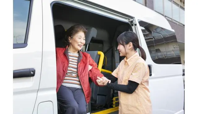 ▼8:00 送迎 (大型ワゴン車に同乗し乗車をサポート)
