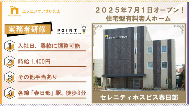 | 事業内容 | 【株式会社エヌエスケアさいたま】 エヌエスケアさいたまのNexus Serenityには【絆を大切にし、平穏な暮らしを提供する企業】という意味があり、 一人ひとりに寄り添い、結びつきを大切にした人と人との絆(きずな)を創り上げていきたいという私たちの想いを込めて、ご利用者様の自分らしく笑顔あふれる生活を実現していきます。 |