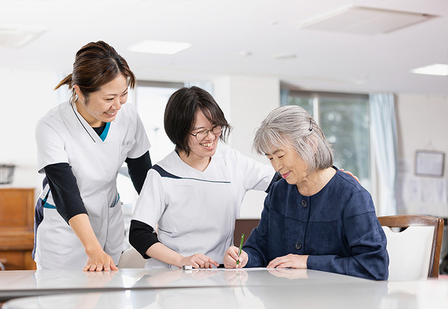 看護師やリハビリスタッフと連携して、利用者さんの在宅復帰のための支援を行っています。具体的には、食事・入浴・排泄の補助などの身体介護や、掃除や洗濯などの生活援助、さらにリハビリスタッフと共にレクリエーションも行っています。季節に応じたイベントも豊富で、利用者さんと一緒に楽しく機能回復に取り組んでいます。資格や経験がなくても、働きながら介護福祉士へのステップアップも目指せます。