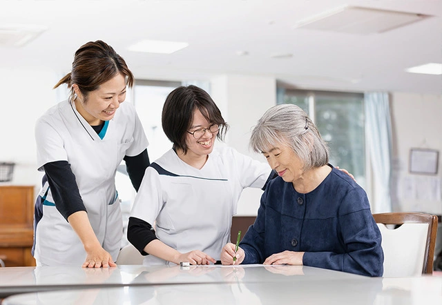看護師やリハビリスタッフと連携して、利用者さんの在宅復帰のための支援を行っています。具体的には、食事・入浴・排泄の補助などの身体介護や、掃除や洗濯などの生活援助、さらにリハビリスタッフと共にレクリエーションも行っています。季節に応じたイベントも豊富で、利用者さんと一緒に楽しく機能回復に取り組んでいます。