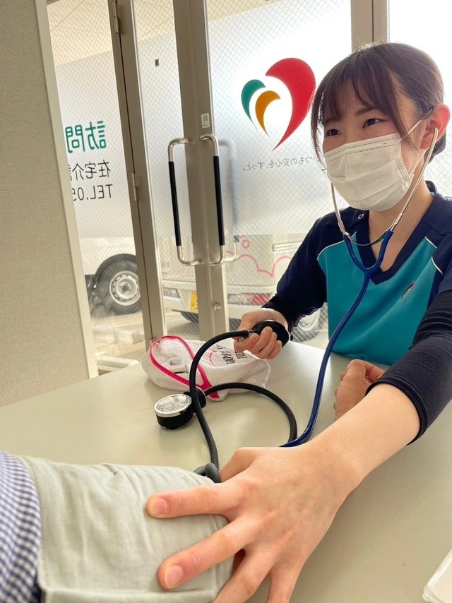 【1.】訪問入浴車に同乗し、お客様宅到着後、バイタルチェックを実施し入浴の可否判断を行います。(体温血圧測定SPO2など)