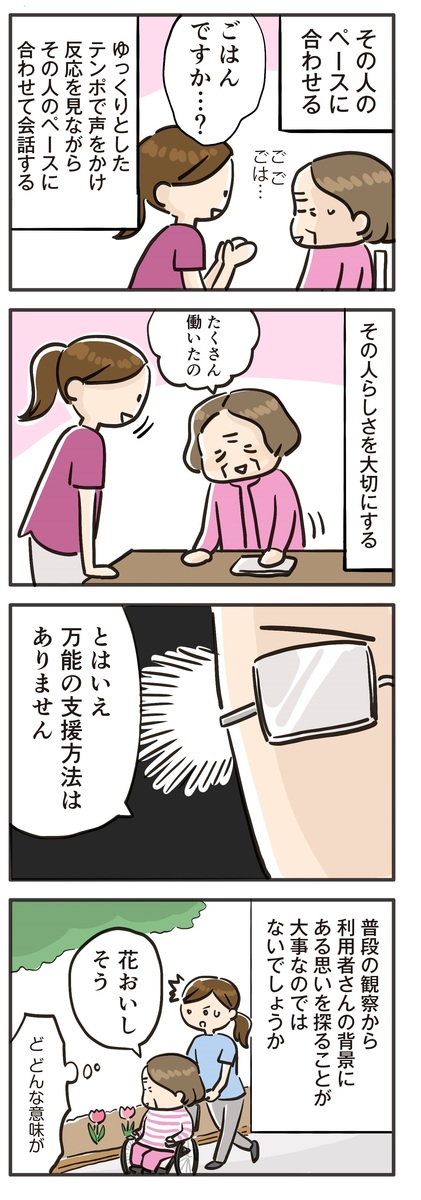 とはいえ方法は無限にありますし、そのときのタイミングで、ご本人にぴったりはまったり、 全然はまらなかったりします。こうしてみたらどうだろう?と考えることこそ、介護の仕事の面白さです。このプロセスを楽しみましょう。