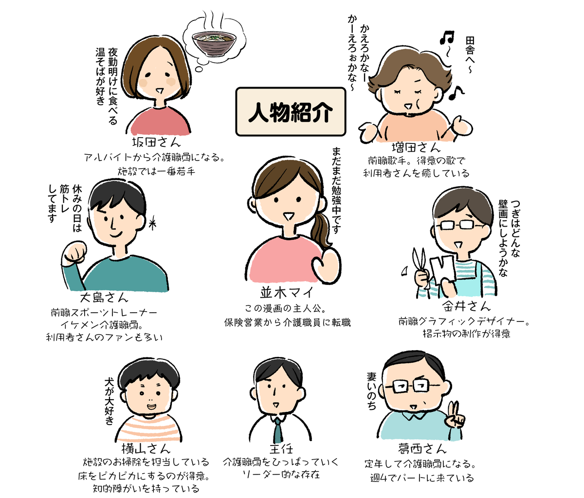「介護職員・並木マイの ほっこり成長日記 ~転職して、介護の仕事はじめました~」 保険会社から介護の仕事に転職した、並木マイさん(31歳)の成長と 介護現場のあるあるを描く、ほっこり癒し系マンガ! 休憩時間、このマンガを読んだあなたが クスっと笑えてちょっと癒され、ほっこりした気持ちになれますように。