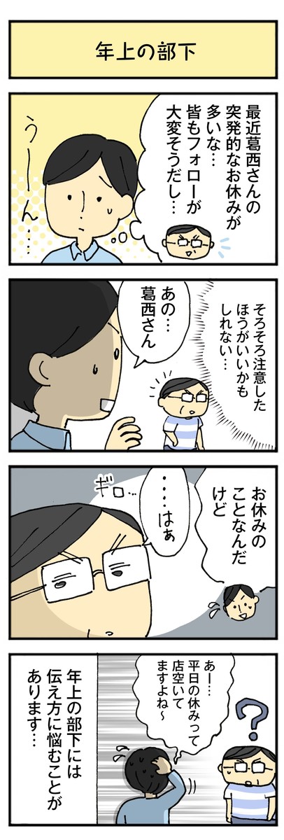 年上の部下には、物事の伝え方を悩んでしまう主任なのでした。
